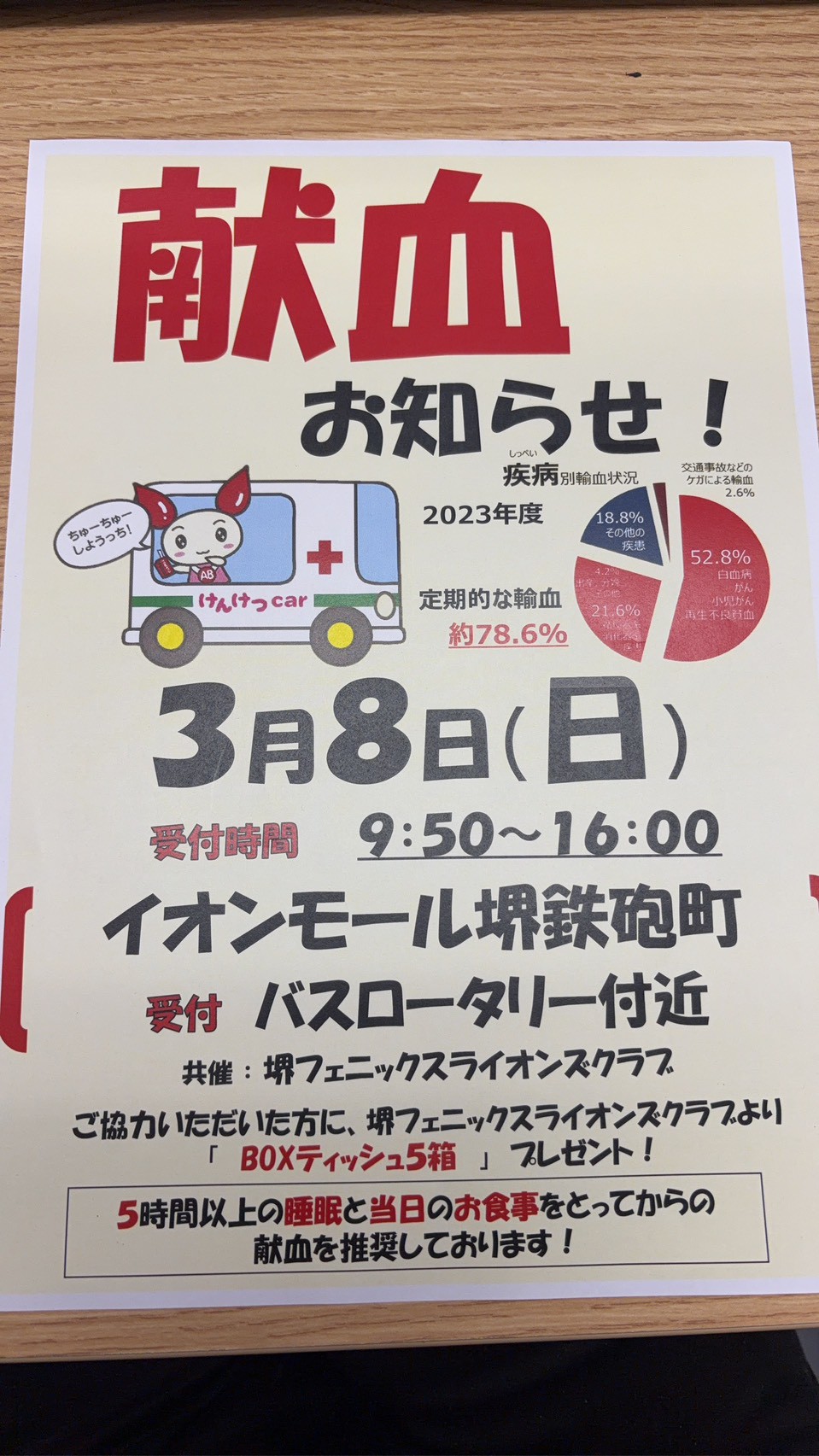 献血例会 投稿日: 2026年3月11日2026年3月11日 by sakaiarigato87 (2026年3月8日)イオンモール堺鉄砲町で行いました。 献血受付数81名採血数合計72名 イオンモール堺鉄砲町でのバス献血が始まって以来の過去最高の人数になりました。 当クラブからも8名が全員400CC献血を行い、貢献しました。 例会報告カテゴリーの記事